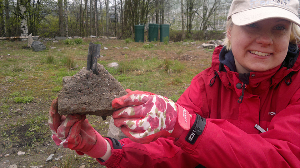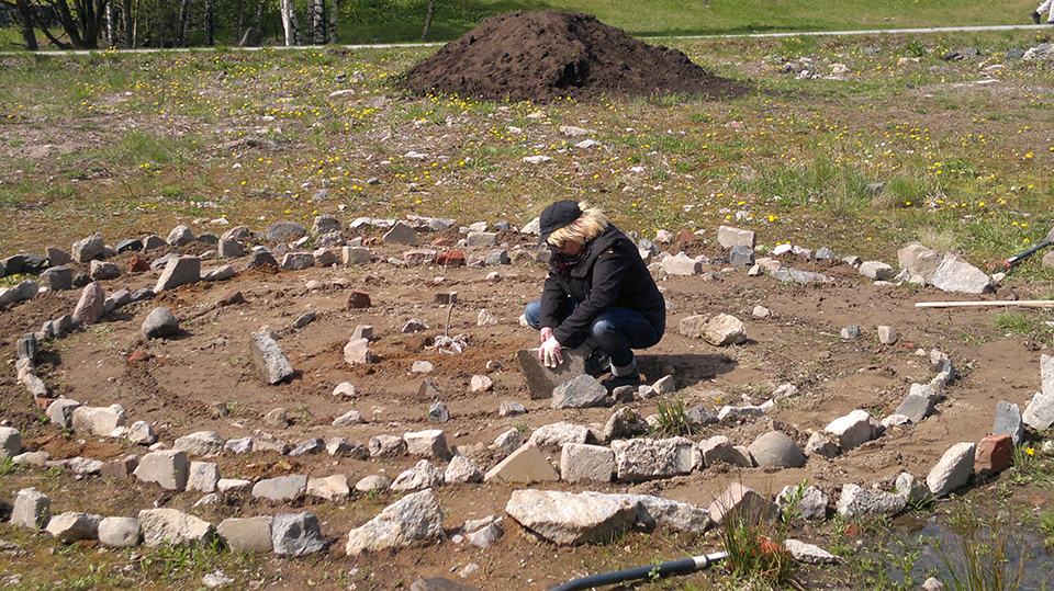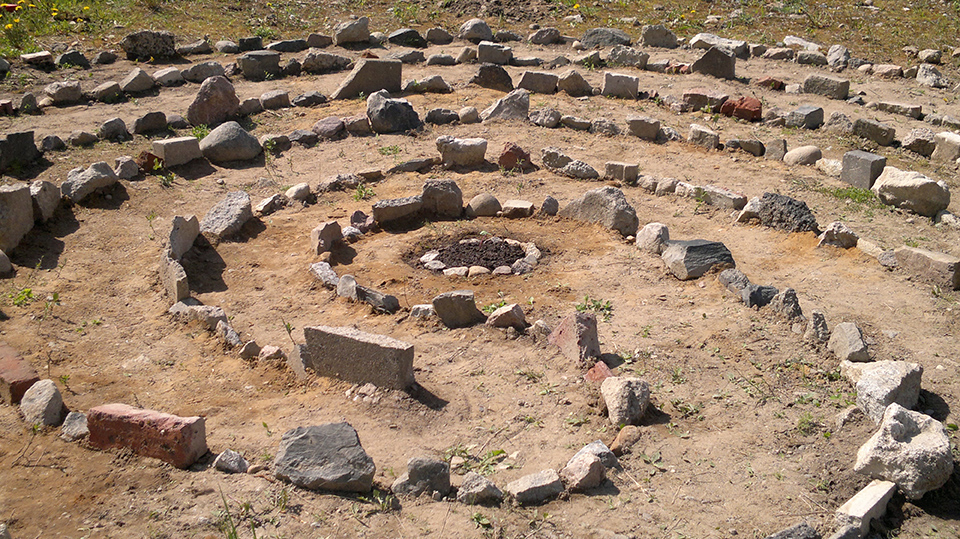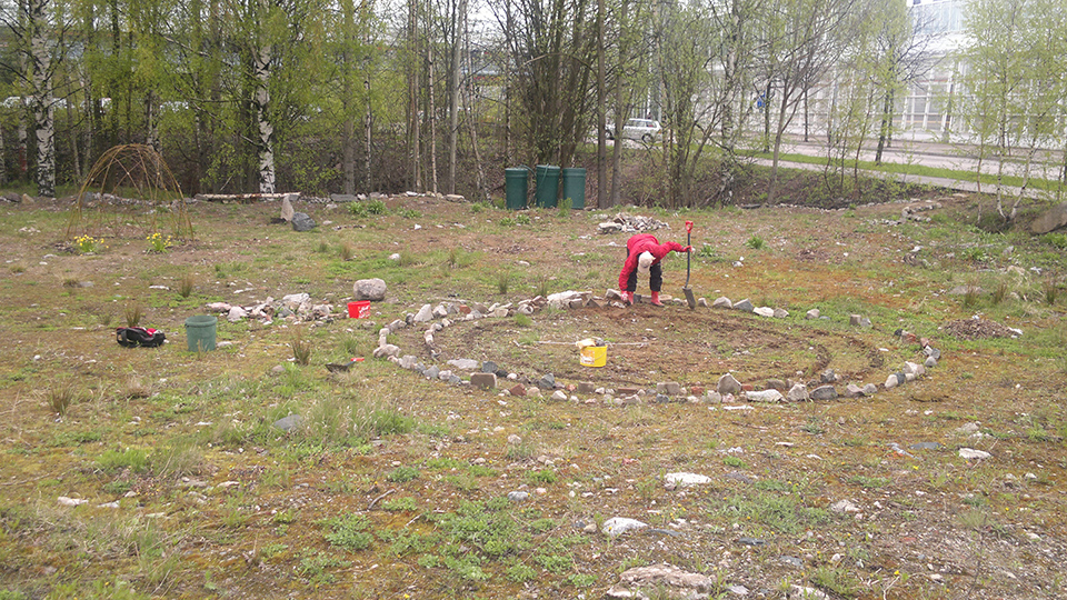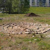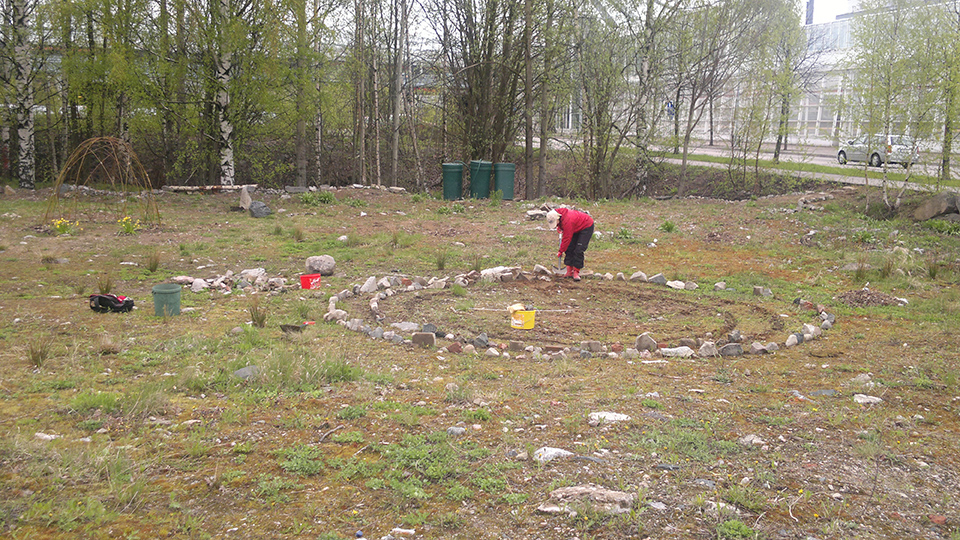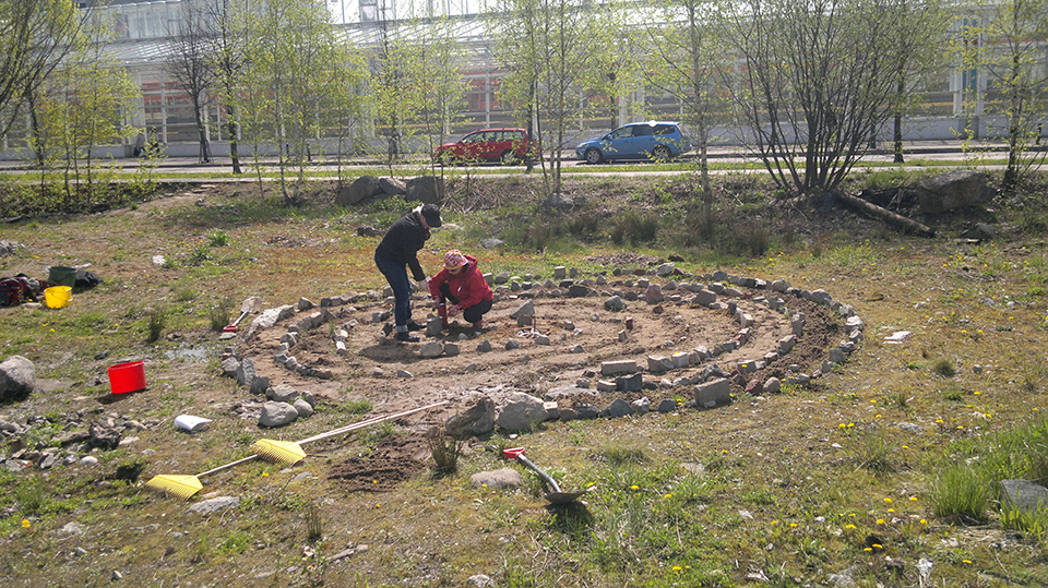 The layout of the labyrinth was based on the traditional Finnish Jatulintarha labyrinths: there are no dead ends, and you can always find your way out. The structure was built using stones and pieces of concrete and brick found on the site. A sunflower – a plant that provides food for the soul and the body – was planted in the centre.