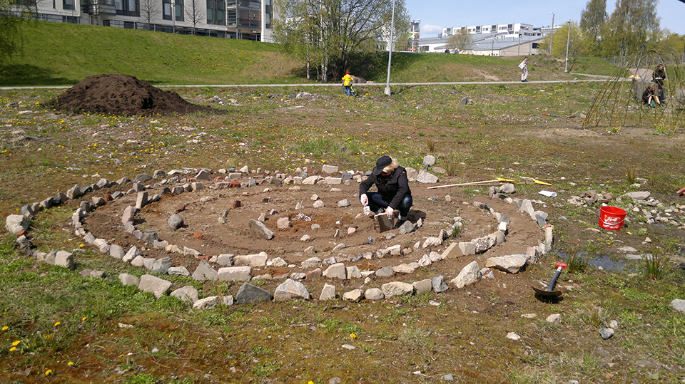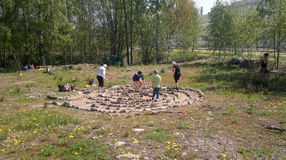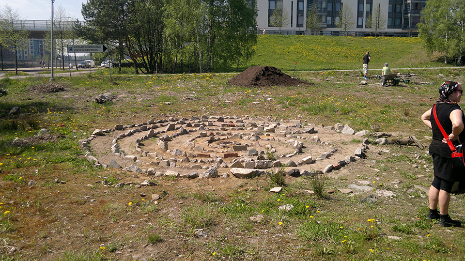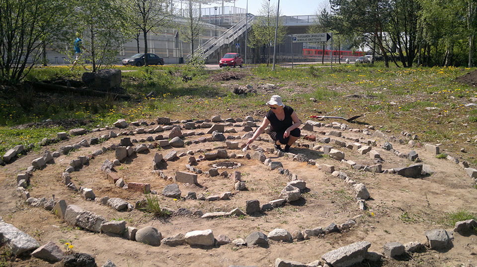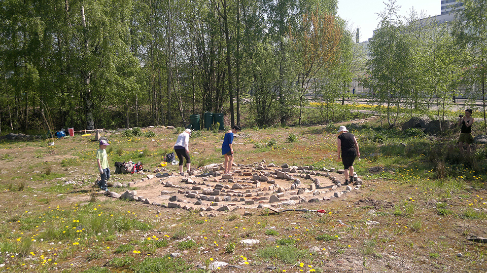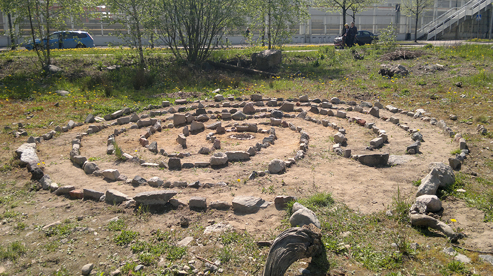 Jatulintarha Stone Labyrinth was a team work by Melina Alexina, Minka Heino, Sini Helander, and myself for Community Art MAA, a project & course tutored by artist Jon Irigoyen at Art School MAA in Spring 2014. It was carried out in cooperation with Pajupalatsi (Willow Palace), a communal environmental art project by artists Petra Martinez and Antti Annanpalo, on an empty site next to the metro station in Vuosaari, Helsinki.