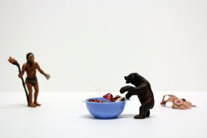 Stop-motion animation Wacky Soup tells about Cake (Homo erectus) and Paté (cave bear), Ice Age roommates, who, surrounded by the continental glacier, have ended up living in the same cave. For these masculine males, e.g. sharing domestic chores can cause tensions. What happens when Paté finds some delicious-looking mushrooms on his food searching trip and cooks them into a soup?